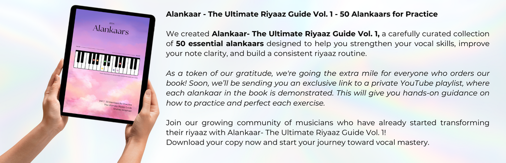 We created Alankaar- The Ultimate Riyaaz Guide Vol. 1, a carefully curated collection of 50 essential alankaars designed to help you strengthen your vocal skills, improve your note clarity, and build a consistent riyaaz routine.
